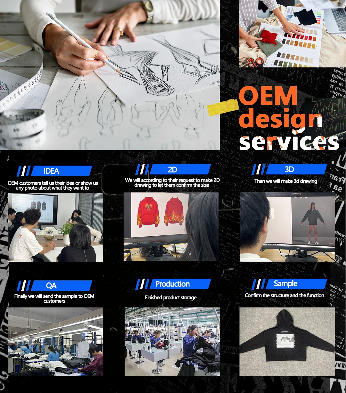 Oieemtt is a professional garment manufacturer specializing in producing high-quality apparel for global brands and businesses. With 15 years of experience in the industry, we are committed to delivering exceptional craftsmanship, competitive pricing, and on-time delivery. Comprehensive Services: We offer a full range of services, from design development and fabric sourcing to production, quality control, and shipping. We are your one-stop solution for all your garment manufacturing needs. Wide Product Range: We specialize in producing a wide variety of garments, including:T-shirts, Hoodies, Sweatshirts, Pants, Jackets Advanced Equipment: Our factory is equipped with state-of-the-art machinery and technology, ensuring efficient production and consistent quality. Strict Quality Control: We implement a rigorous quality control system throughout the entire production process to ensure that every garment meets your specifications and exceeds your expectations.